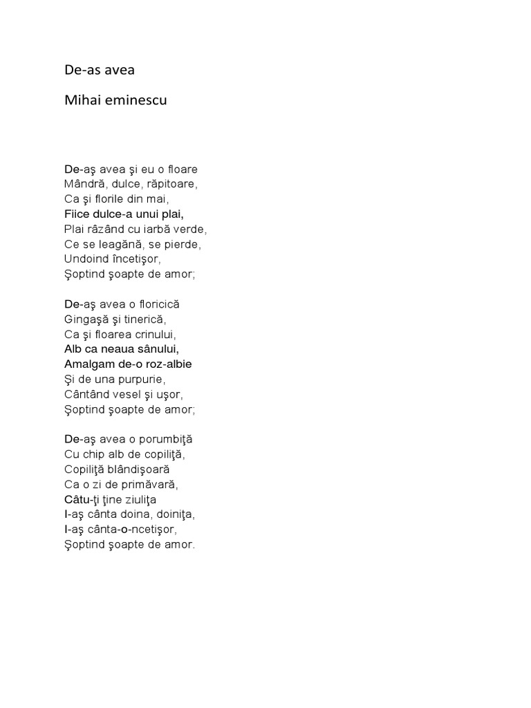 De aş avea şi eu o floare mândră dulce răpitoare ca şi florile din mai fiice dulce a unui plai plai râzând cu iarbă verde ce se leagănă se pierde undoind încetişor şoptind şoapte de amor. De as avea mireasma florii. Odată cu publicarea sa iosif vulcan directorul revistei îi schimbă numele poetului din eminovici în eminescu nume cu care acesta se va identifica îmediat și pentru totdeauna. De as avea o floricica gingasa si tinerica ca si floarea crinului alb ca neaua sanului amalgam de o roz albie si de una purpurie cantand vesel si usor soptind soapte de amor.