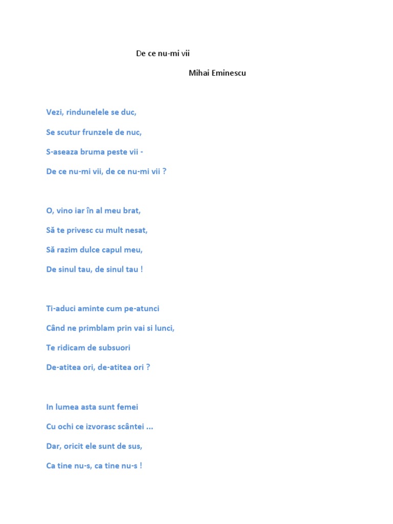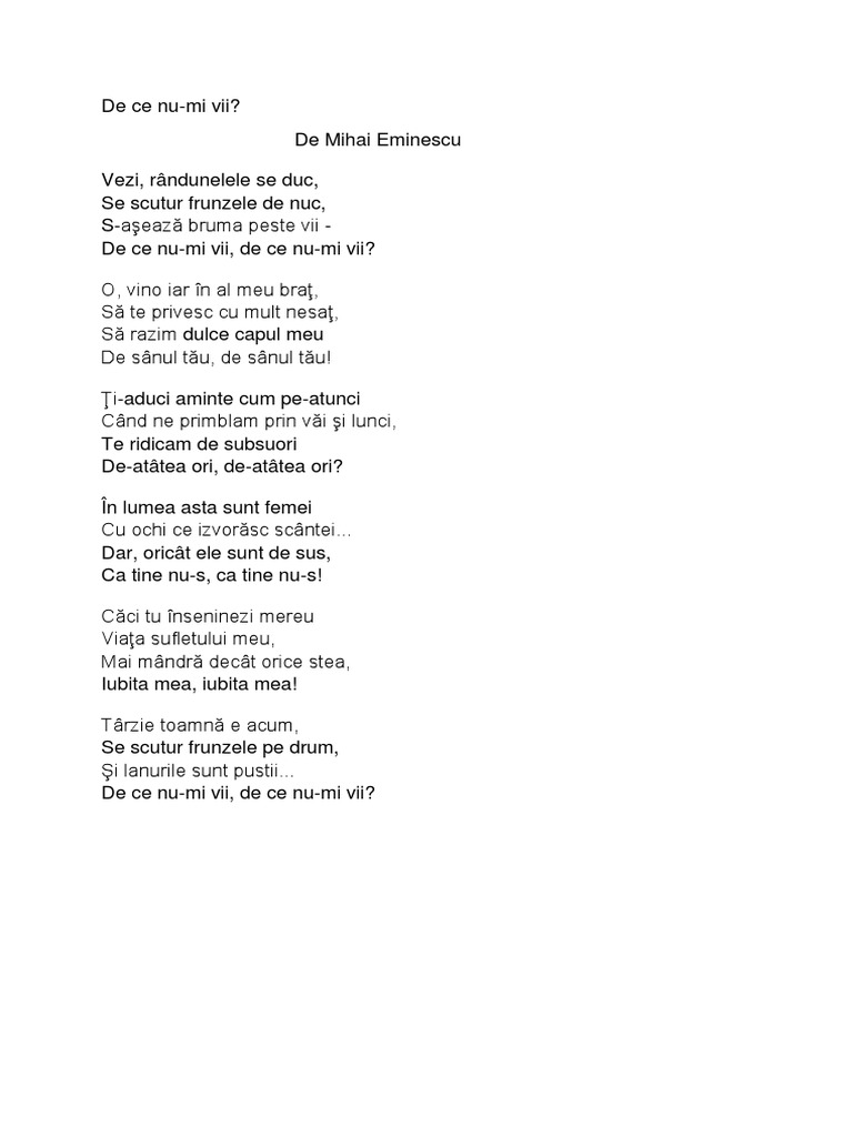 De Ce Nu Mi Vii Poezii De Dragoste Mihai Eminescu