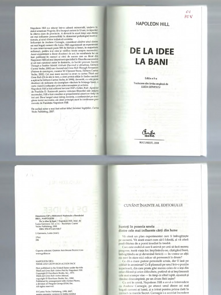 De la idee la bani. Report napoleon hill de la idee la bani pdf please fill this form we will try to respond as soon as possible. Share embed napoleon hill de la idee la bani pdf. Napoleon hill şi a petrecut 20 de ani studiind şi intervievând peste 500 de oameni de succes în afaceri privind modul în care nbsp şi au dobândit ei succesul. Principalul element comun al acestora este un scop dorință vis bine definit şi dorința intensă de a reuşi.
