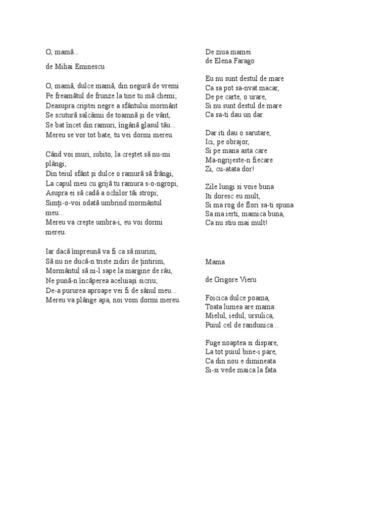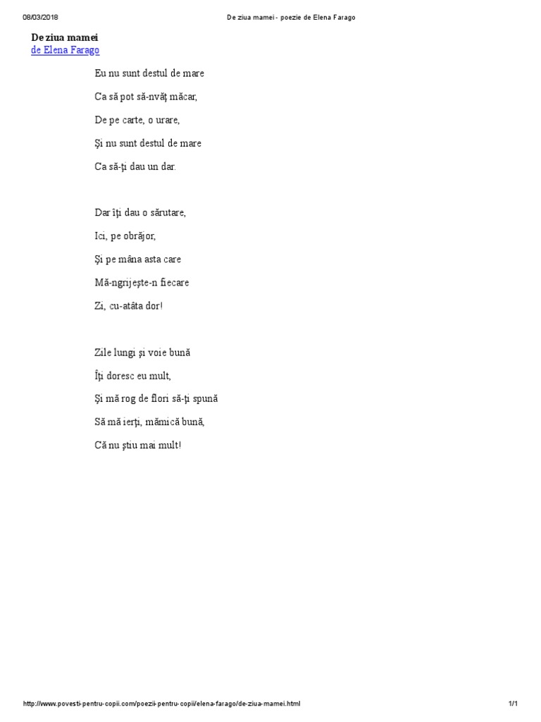 De ziua mamei de elena farago. Dar îţi dau o sărutare ici pe obrăjor şi pe mâna asta care mă ngrijeşte n fiecare zi cu atâta dor. Dar îți dau o sărutare ici pe obrăjor și pe mâna asta care mă ngrijește n fiecare zi cu atâta dor. Eu nu sunt destul de mare ca să pot să nvăț măcar de pe carte o urare și nu sunt destul de mare ca să ți dau un dar. şi iar mi i sufletul la tine cântă astăzi viaţa.