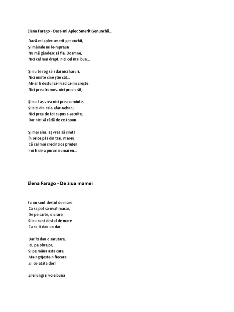Elena farago în secțiunea poezii comenteaza la de ziua mamei. Dar iti dau o sarutare ici pe obrajor si pe mana asta care ma ngrijeste n fiecare. Dar îți dau o sărutare ici pe obrăjor și pe mâna asta care mă ngrijește n fiecare zi cu atâta dor. De ziua mamei de elena farago eu nu sunt destul de mare ca să pot să nvăț măcar de pe carte o urare și nu sunt destul de mare ca să ți dau un dar.