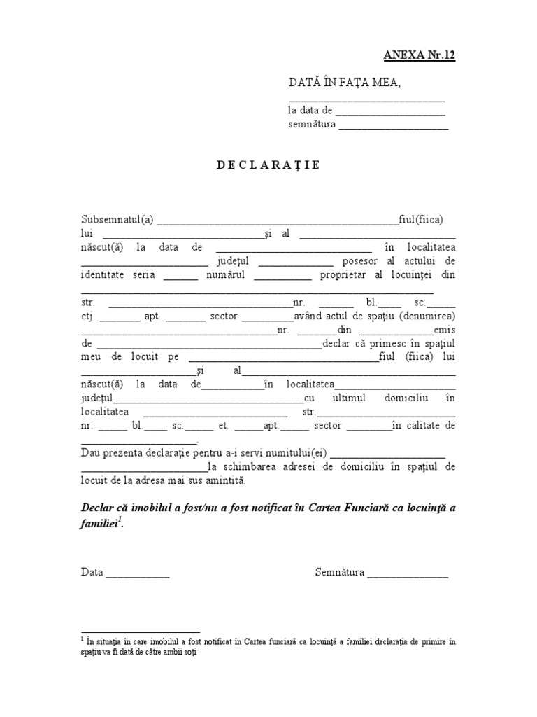 Anexa12 Declaratie De Luare In Spatiul Locativ A Proprietarului Pdf