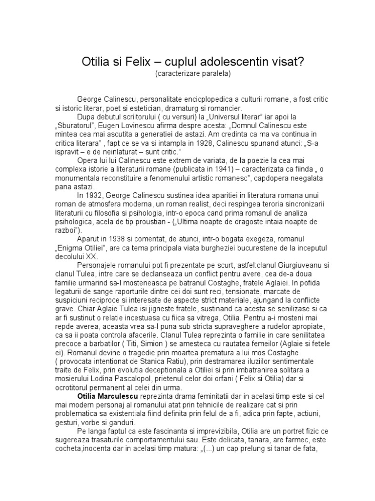 Enigma Otiliei Caracterizare Otilia Si Felix