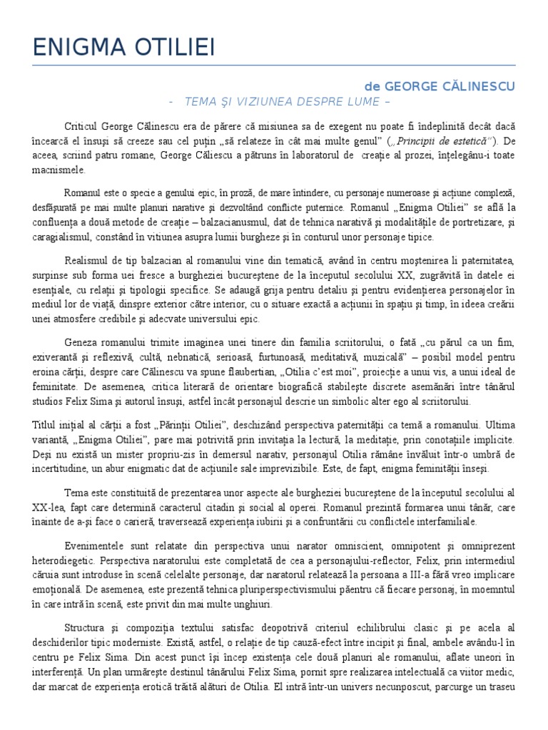 Doc Călinescu Enigma Otiliei Temă Si Viziu Ne Andreea Sb Academia Edu