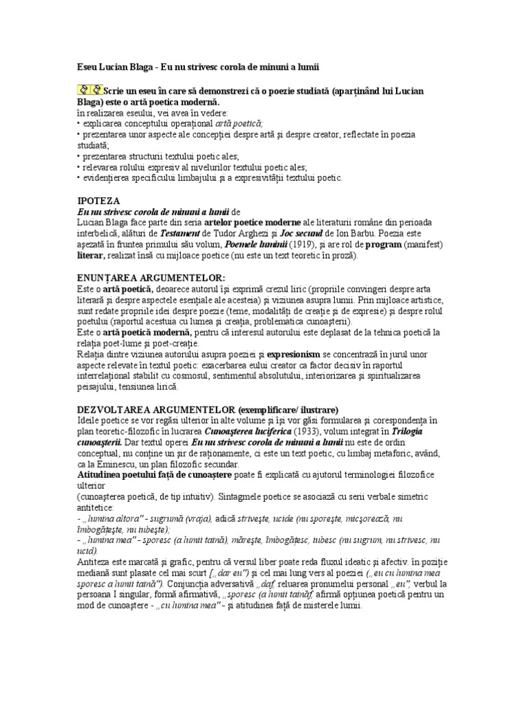 Eu Nu Strivesc Corola De Minuni A Lumii Eseu Bac