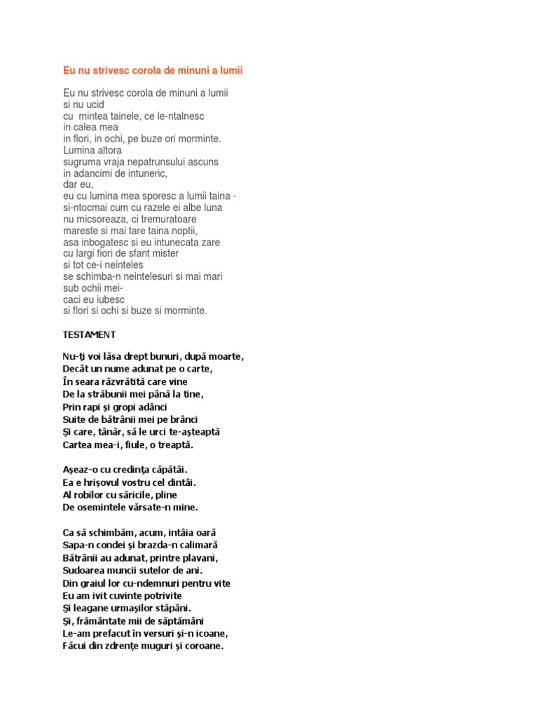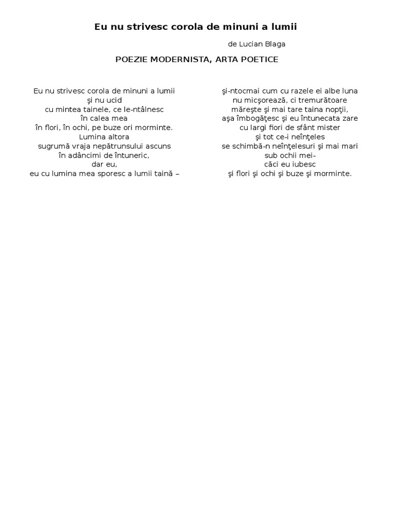 Lucian Blaga Eu Nu Strivesc Corola De Minuni A Lumii Pdf