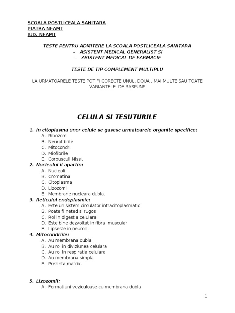 Teste Pentru Admitere La Scoala Postliceala Sanitara