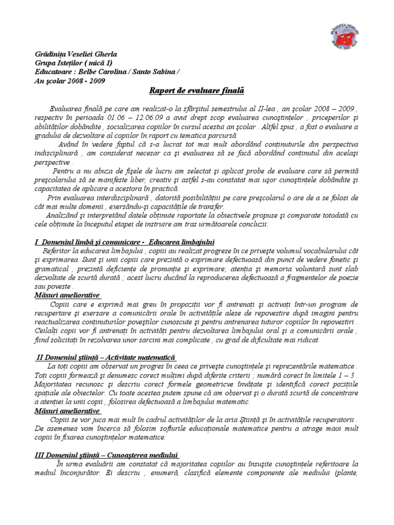 Raport Evaluare Finala Grupa Mica Ionela 2019